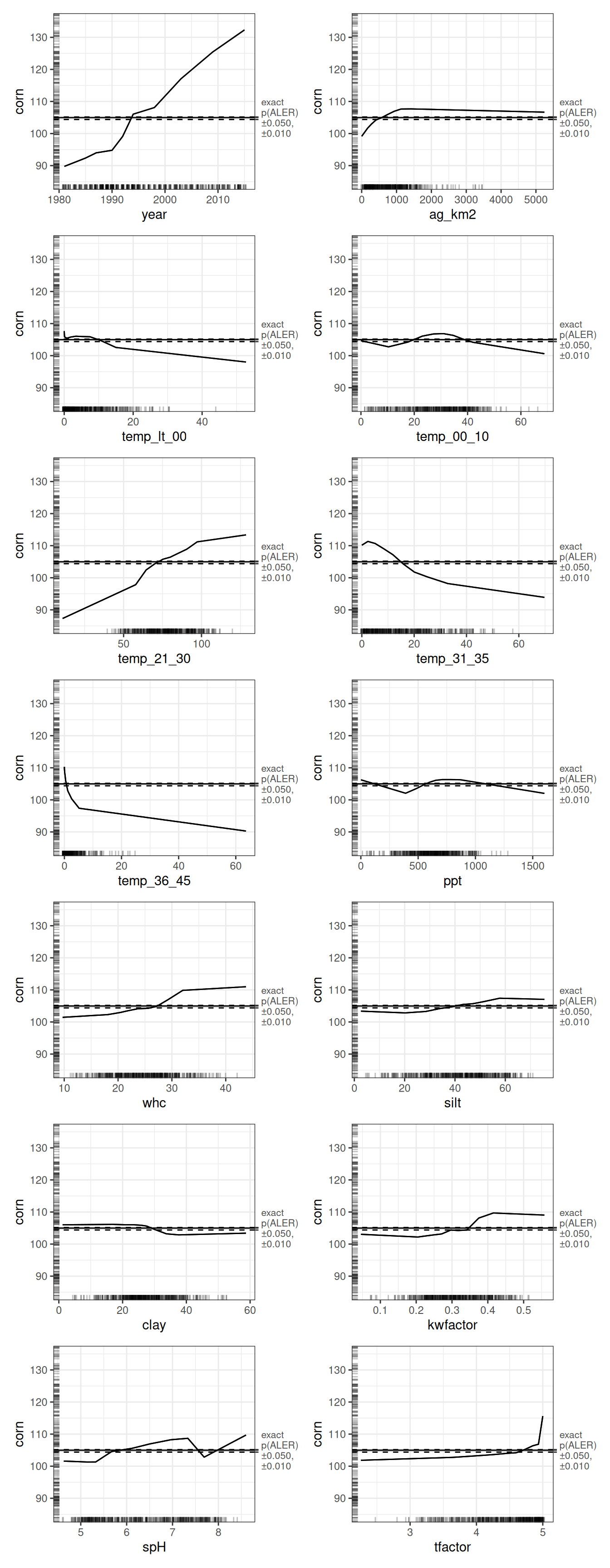 A second important methodological result concerns interactions. Although we computed all pairwise ALE interactions, none of them are practically important. The interaction effects are small, and none exceed our threshold of two bushels per acre. This matters. Because interactions do not meaningfully distort the marginal relationships, we can interpret the main effects directly without worrying that strong interaction structure is hiding underneath.