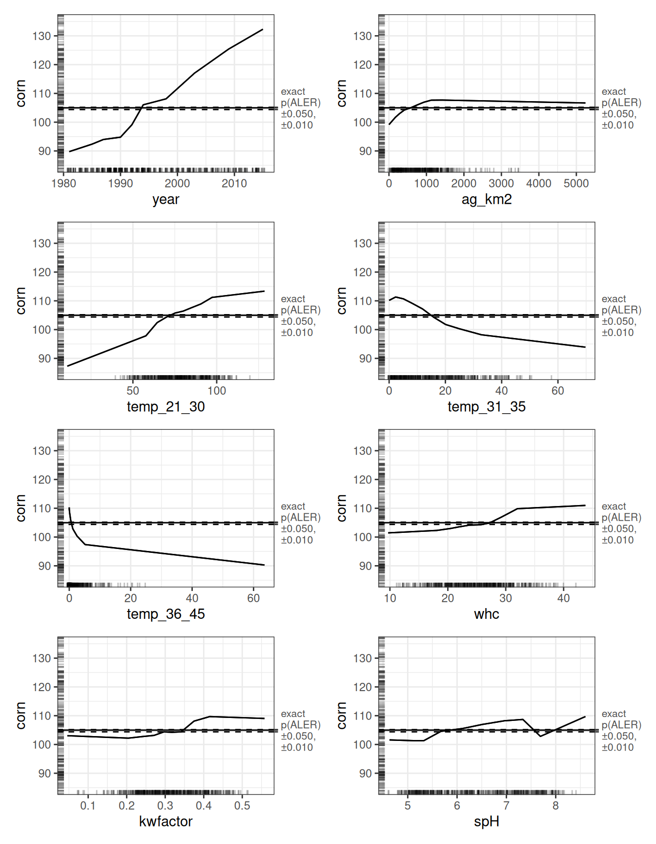 What matters is magnitude. Only eight variables exhibit ALED effects of at least two bushels per acre. These are the effects that clear our threshold for practical importance, and we display their ALE plots accordingly.