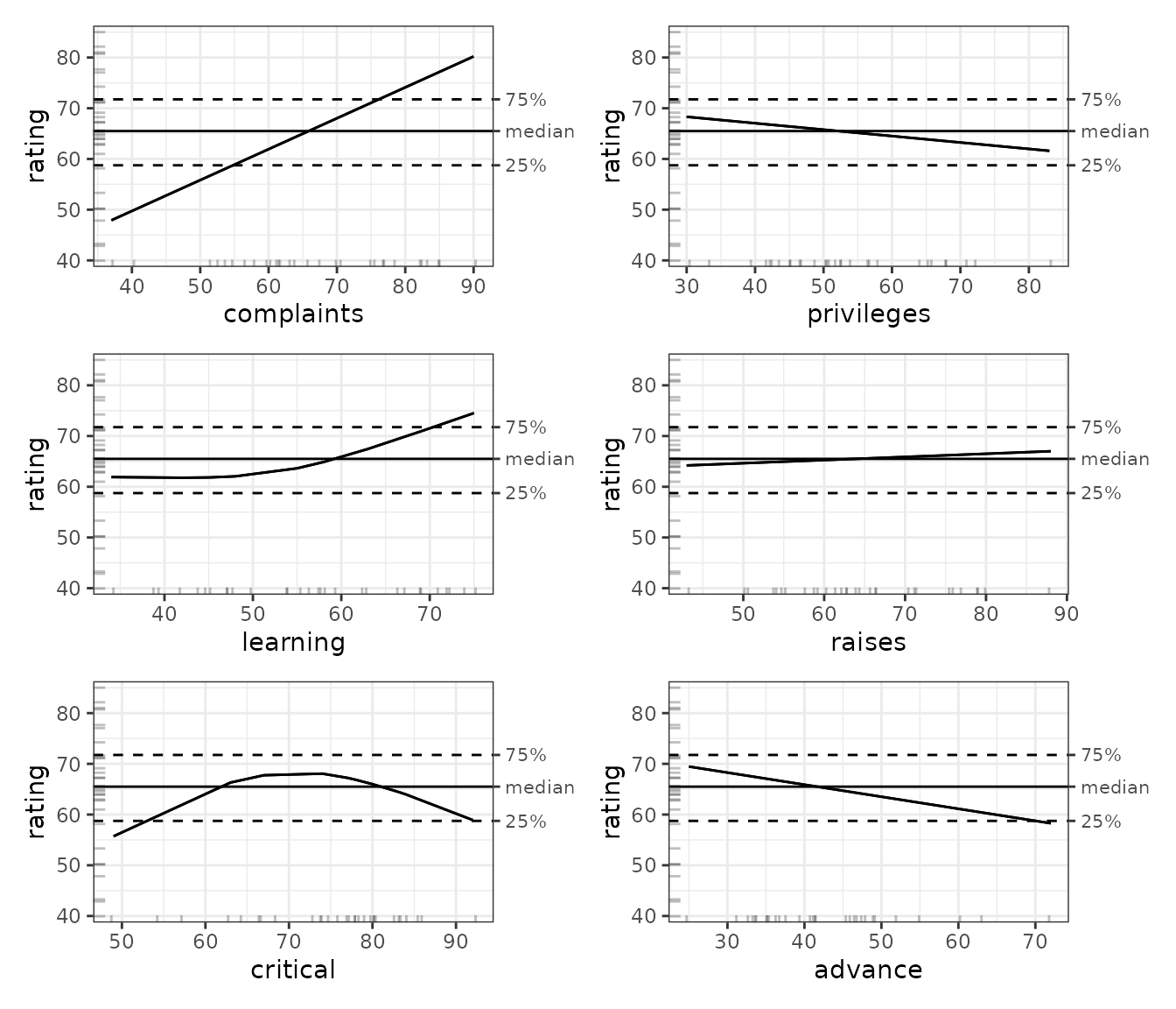 This visualization confirms what we see in the model coefficients above: complaints have a strong positive effect on ratings and learning has a more moderate effect. However, the ALE indicates a stronger effect of advance than the regression coefficients suggest. The other variables have relatively little effect on ratings. We will see shortly that proper bootstrapping of the model can shed some light on the discrepancies.
